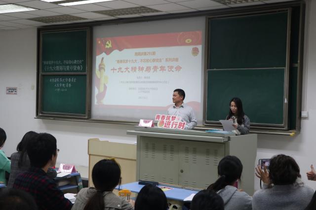 据悉,“青春筑梦十九大 不忘初心跟党走”系列主题讲座是由校团委主办,旨在让专家、学者与青年面对面,引导广大团员青年全面深入学习党的十九大会议精神,心系国家、坚定理想、筑梦青春。