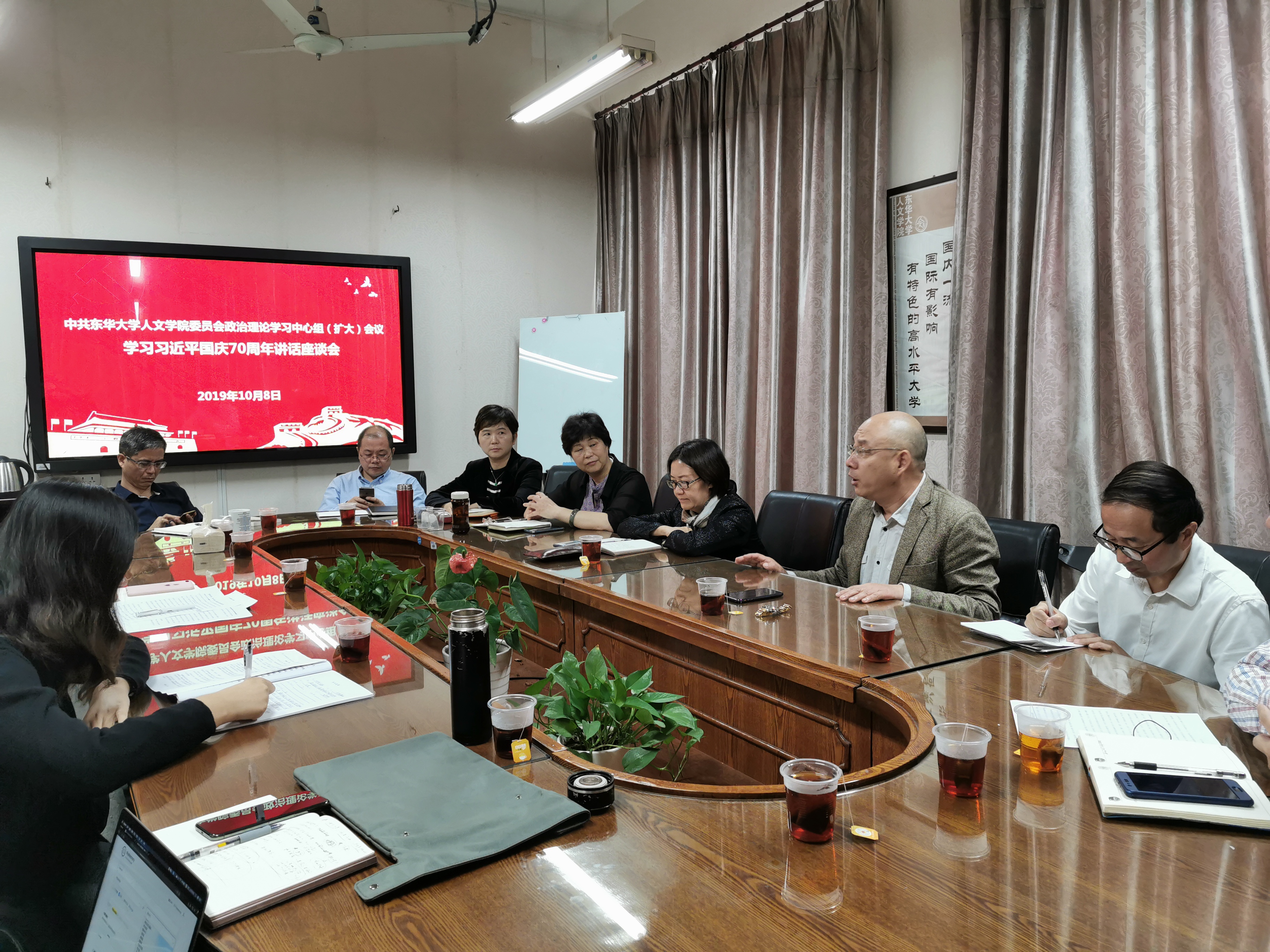 10月8日上午,为庆祝新中国成立70周年,深入学习领会习近平总书记讲话精神,pg娱乐电子游戏官网入口党委召开政治理论学习中心组(扩大)会议,组织学院党委班子成员、教师代表与学生代表,围绕习近平总书记在庆祝大会上发表的重要讲话,畅谈学习体会,分享观看庆祝大会和阅兵式的感想与收获。pg娱乐电子游戏官网入口党委副书记刘淑慧出席本次座谈会,会议由pg娱乐电子游戏官网入口党委书记王英主持。
