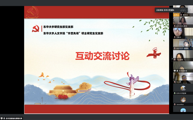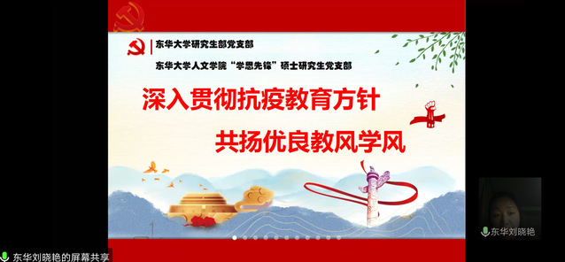 “学思先锋”硕士研究生党支部副书记金蝶分享了居家网络学习感受与启示,通过具体的调研数据分析了居家网路学习的优势与劣势,最后提出了从学生自制力、学习观念、自我学习意识出发的几点建议。支部毕业生党员穆莉以“漫漫研途、孜孜求索:作奋进有为的人文青年”为主题向我们分享了读研的感悟,激励同学们把握好在校时间,注重个人的全面发展。在互相交流讨论环节,学生党员们结合网络教学的实际发表了自己的网课体会,研究生部党支部的教师党员们也逐一介绍了疫情期间网课的建设情况,同时对同学们的反馈进行了回应与交流。