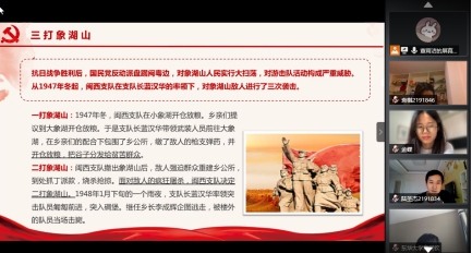 支部党员分享抗战故事和解放战争故事,进一步重温革命历史,坚守初心。韩雪通过一辆自行车的抗战故事告诉我们,坚信往事不如烟,一切都不会过去,透过那辆自行车自行车看到的是共和国的巨变,也看到渡尽劫波后敌人的忏悔。孙怀芹向大家分享战神粟裕的故事,毛泽东也感慨道“壮哉粟裕”,粟裕一生功绩颇丰,但他淡泊名利,坚持一切为了人民,保持朴素作风。袁潇分享少年抗日英雄王二小的故事,王二小虽然年龄不大,但却有大英雄的精神品格,启示我们遇到困难不屈服、不放弃。钟昱借三打象湖山,灭敌人威风,长人民志气的故事告诉大家要不怕困难,坚持不懈,团结群众,坚定革命信念。