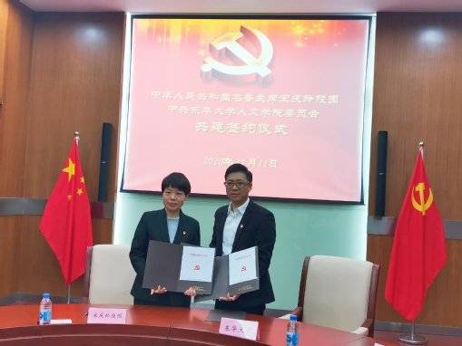 为认真贯彻落实党的十九大及十九届系列全会精神,创新基层党建工作载体,提高基层党建工作水平,进一步巩固“四史”学习教育活动成果,实现基层党建工作优势互补、资源共享、融合互动,2020年11月11日,pg娱乐电子游戏官网入口党委与宋庆龄陵园党支部签订了区域化党建共建协议书。宋庆龄陵园工会主席蒋慈华,宣教部副主任顾佳成,游客服务中心主任孙青,pg娱乐电子游戏官网入口党委书记韩哲宇,党委副书记资雪琴,党委委员、传播系系主任叶长海,党委委员、专职党务干部周铮铮,专职辅导员木拉提、穆莉,出席本次签约仪式。