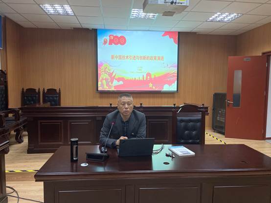 4月27日下午,pg娱乐电子游戏官网入口党委“名师初心讲堂”在延安路校区中南305室模拟法庭举行。中国科学与科技政策研究会理事、中国科技史学会物理学史分会理事仪德刚教授作关于“新中国技术引进与创新的政策演进”的党史学习教育专题党课。pg娱乐电子游戏官网入口院长、党委副书记张科静主持本次讲座,学院党委委员和全体师生党员参与本次专题党课。