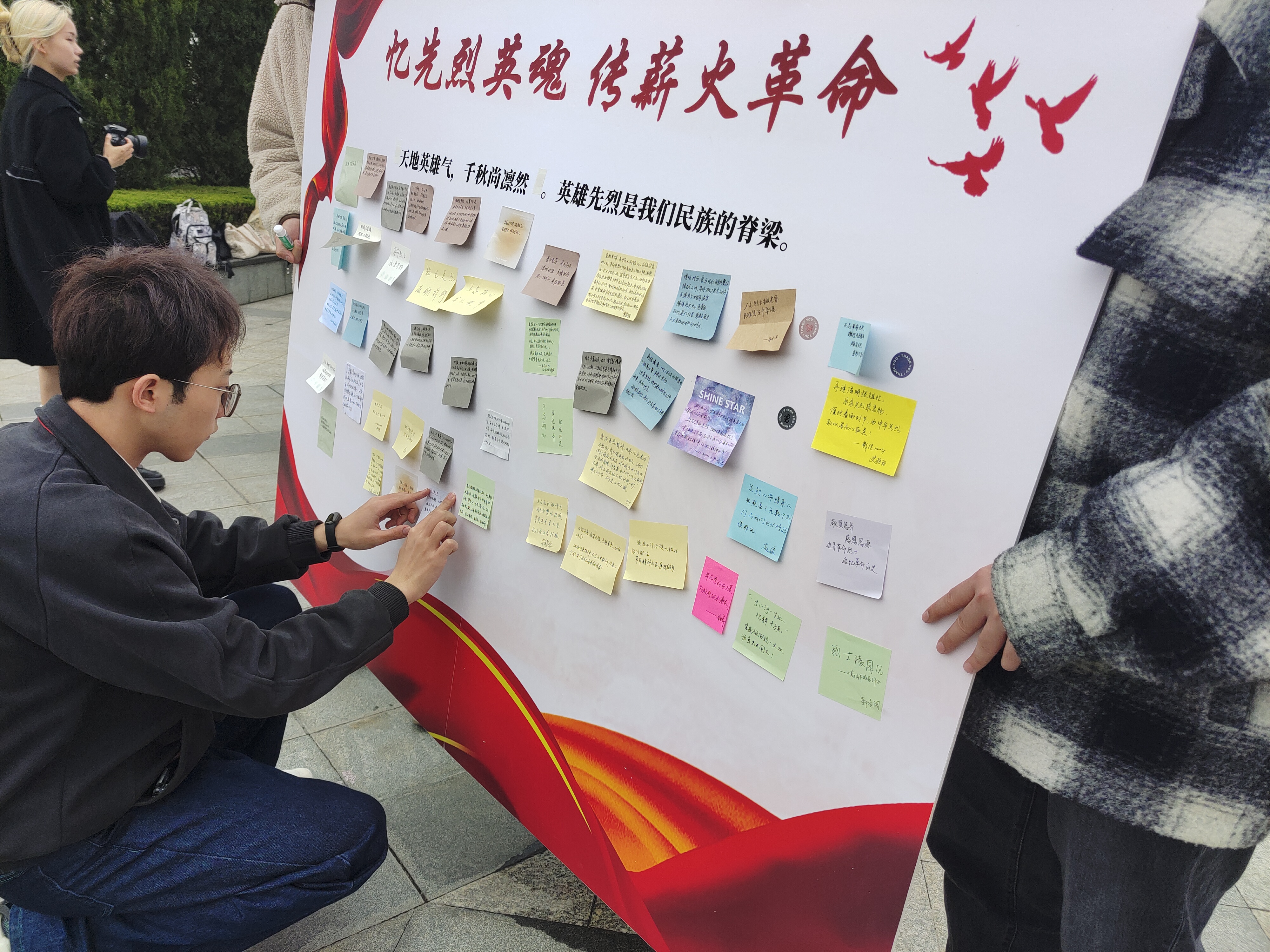 “天地英雄气,千秋尚凛然”。缅怀先烈,是对近代以来为争取民族独立、国家富强、人民幸福而牺牲英烈的深情礼赞,更是对中华民族精神血脉的赓续和传承。活动最后,团学骨干代表将自己对于本次活动的感想与对祖国美好的祝福,张贴在留言板上。同学们纷纷表示要发扬中华血脉里的不朽民族魂、继承英雄先烈们的革命遗志,坚定马克思主义的信仰,坚定中国特色社会主义的信念,坚定实现中华民族伟大复兴中国梦的信心,争做英雄精神的坚定信仰者、有力传播者和积极践行者,以永不懈怠的精神状态和一往无前的奋斗姿态投身强国伟业,在实现中华民族伟大复兴中国梦的时代洪流中踔厉奋发、勇毅前行!