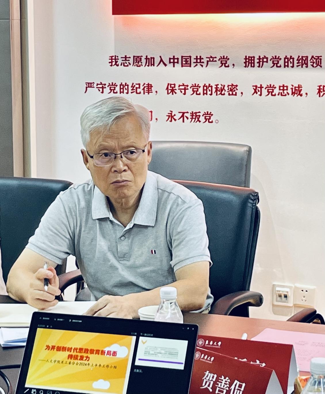 会议上,pg娱乐电子游戏官网入口关工委常务副主任贺善侃首先对2024年上半年学院关工委的工作做了梳理总结。他谈到,pg娱乐电子游戏官网入口关工委分会于2014年成立,至今已走过整整十年历程。10年来,学院关工委分会始终紧紧围绕“不断开创新时代思政教育新局面”、“努力培养更多让党放心爱国奉献担当民族复兴重任的时代新人”这个宗旨,持续发力,一以贯之,久久为功。据统计,自2014年至2023年底,学院关工委分会4位老同志面向pg娱乐电子游戏官网入口学生开展咨询活动200余次,咨询学生数共达3250多人次;3位参加讲师团的老同志面向全校各学院的入党积极分子、发展对象、预备党员等开设党课(讲座)共约269次,涉及专题60余个,听讲人次共达28371(近3万),累计获得过4类8次的上海市级及以上的先进集体称号、参与完成了9项教育部关工委和上海市教委关工委课题研究。随后,贺老师聚焦老教授咨询、学院课程思政建设、关工委日常活动、关工委课题研究、校内外其他公益学术活动等五方面对上半年的工作内容做了全面详细的介绍。此外,他对下半年的工作进行了展望,学院关工委将继续深入学习贯彻党的二十大精神和东华第十一次党代会精神,围绕新中国成立75周年广泛开展爱党爱国爱社会主义教育,激励青年学生厚植家国情怀、砥砺强国之志。