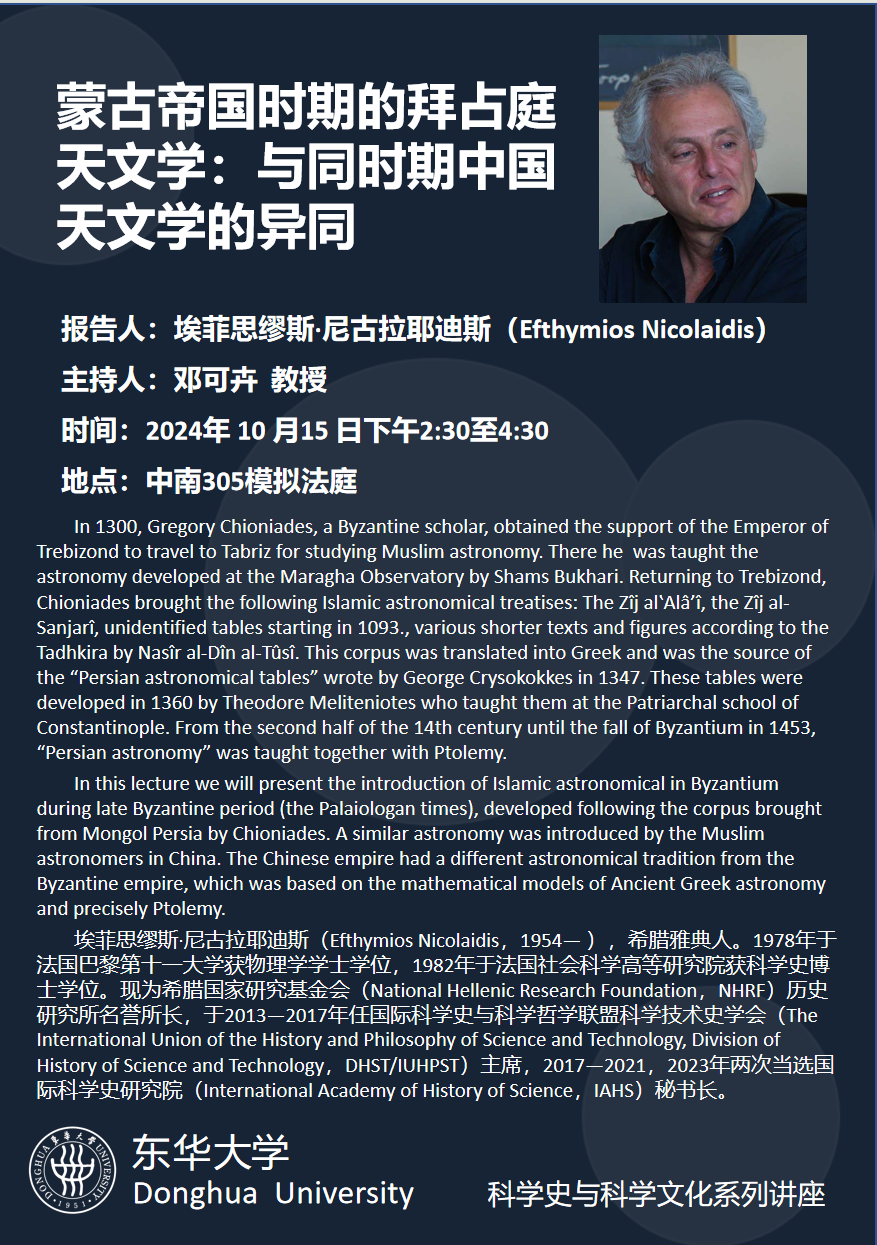 2024年10月15日下午,pg娱乐电子游戏官网入口有幸邀请到希腊国家研究基金会(NHRF)历史研究所名誉所长、前国际科学史研究院秘书长(lAHS)Efthymios Nicolaidis教授来我院做专题讲座,讲座的题目为“蒙古帝国时期的拜占庭天文学:与同时期中国天文学的异同”。讲座由pg娱乐电子游戏官网入口邓可卉教授主持,吸引了学院多位教授及研究生到场。