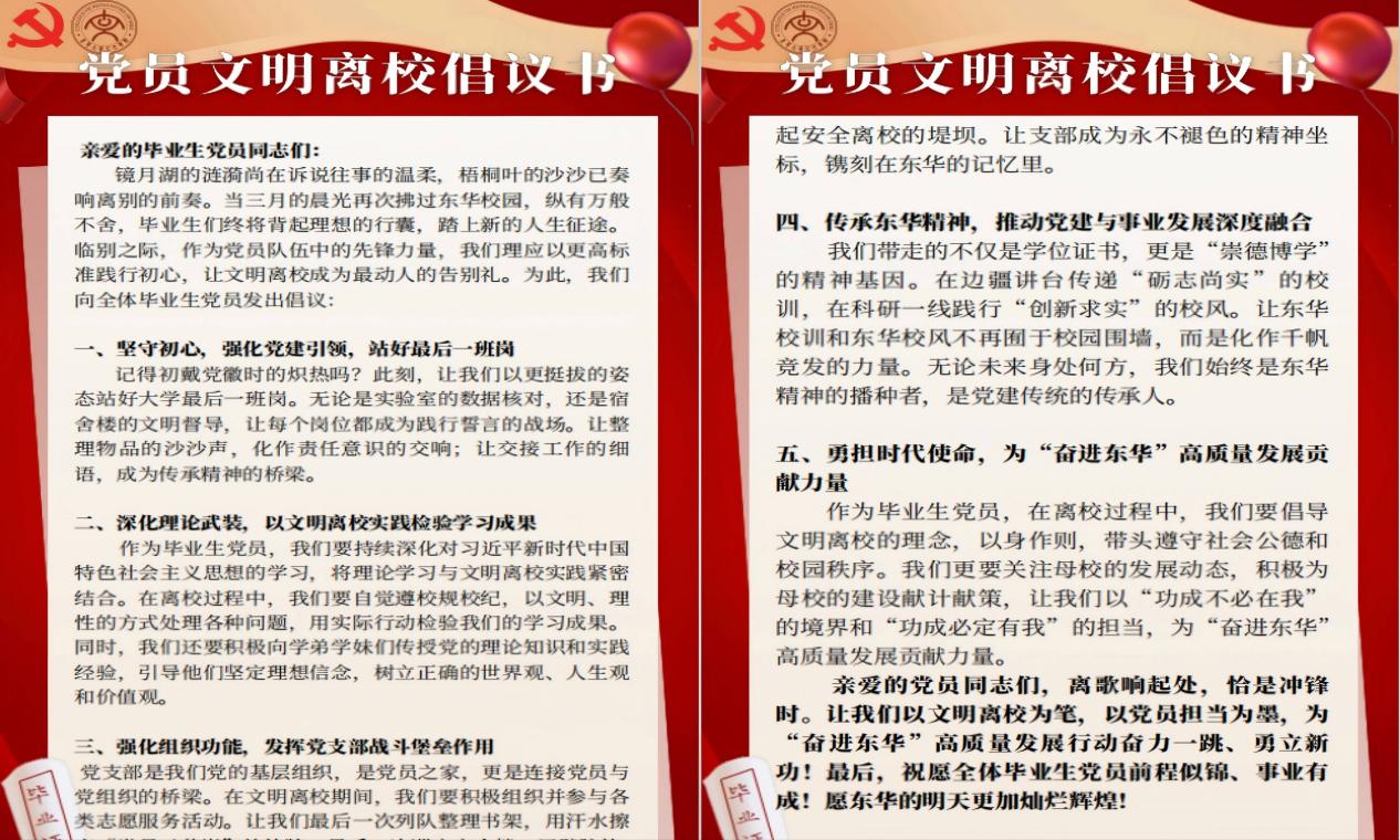 铭记校训初心,践行文明离校。研究生毕业在即,带走的不仅仅是一张学位证、毕业证,更是pg娱乐电子游戏官网入口“崇德博学,砺志尚实”校训的精神内涵。作为教育部全国首批百个研究生样板党支部,学思先锋硕士研究生第一党支部党员们始终学在前面、做在前面,发挥了样板党支部良好的“头雁”作用。毕业生党员代表张雨菲宣读了《党员文明离校倡议书》,号召大家“站好最后一班岗,传递东华正能量”,并在承诺书上郑重签名。随后,在孙晓冬的带领下,全体党员面向党旗重温入党誓词,铮铮誓言回荡会场,彰显青年党员的责任担当。