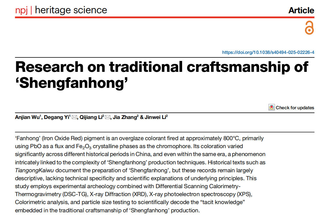 近日,我院仪德刚教授团队联合景德镇陶瓷大学李其江研究员团队,在文化遗产领域权威期刊《遗产科学》(npj Heritage Science)发表题为“Research on traditional craftsmanship of ‘Shengfanhong’”的论文。该论文第一作者为pg娱乐电子游戏官网入口博士生吴安健,仪德刚教授、李其江研究员担任通讯作者,pg娱乐电子官网为第一署名单位。研究得到国家自然科学基金项目和pg娱乐电子官网2025年人文社会科学学科建设及重大预研项目的资助。